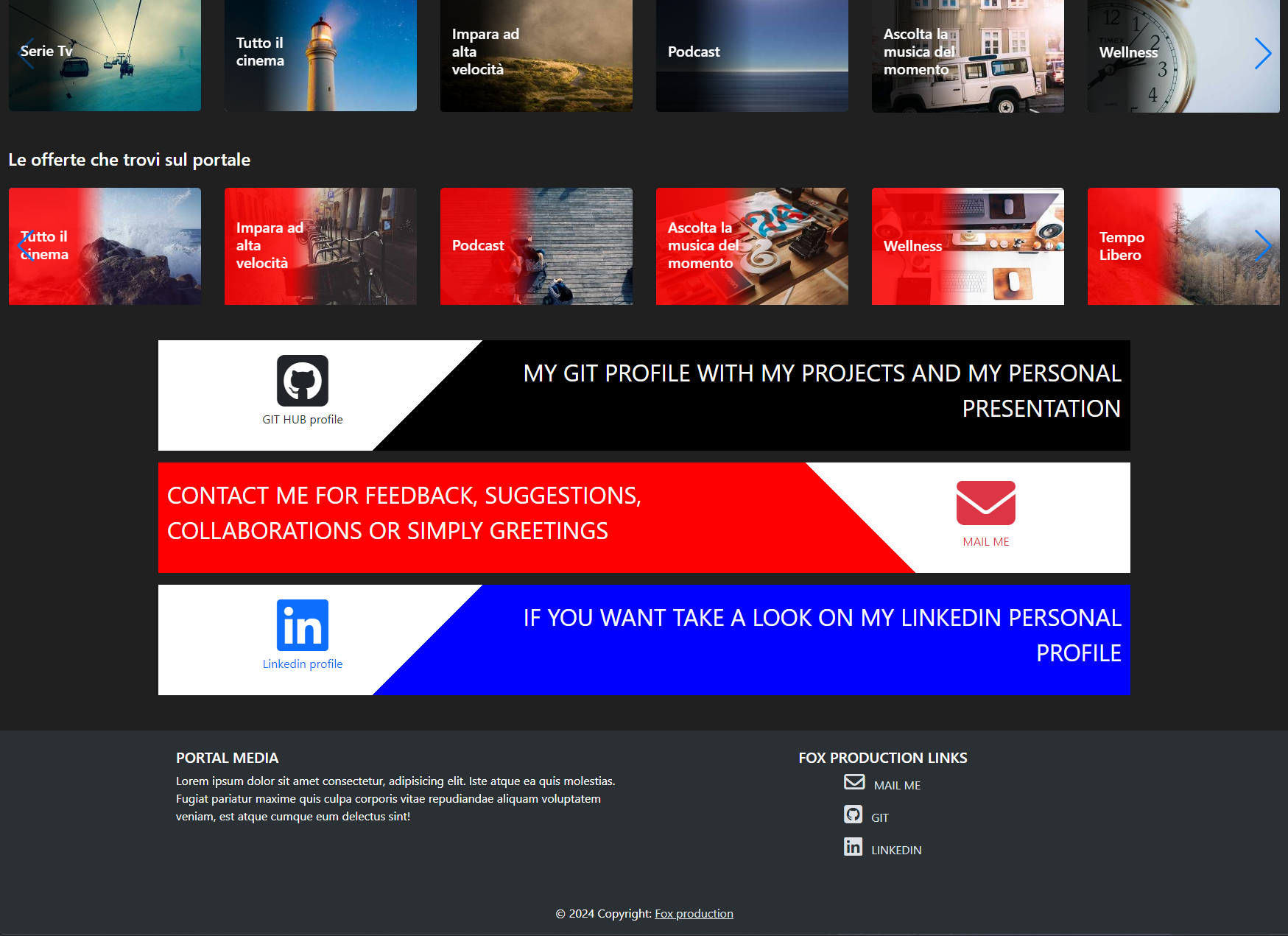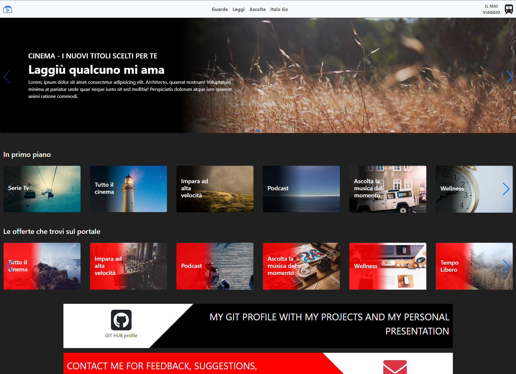 Un Portale con Contenuti Multimediali dove l'utente finale può scegliere di riprodurre un video, ascoltare musica, leggere un libro e altro ancora.. Adatto per le aziende che vogliono intrattenere i propri utenti. In questo progetto è stata inserita una Pagina Amministratore interamente personalizzabile, accessibile solo da personale autorizzato per gestire, aggiungere o cancellare tutti i contenuti disponibili e con una Dashboard Amministratore con la possibilità di inserire qualsiasi info sotto forma di widgets.
